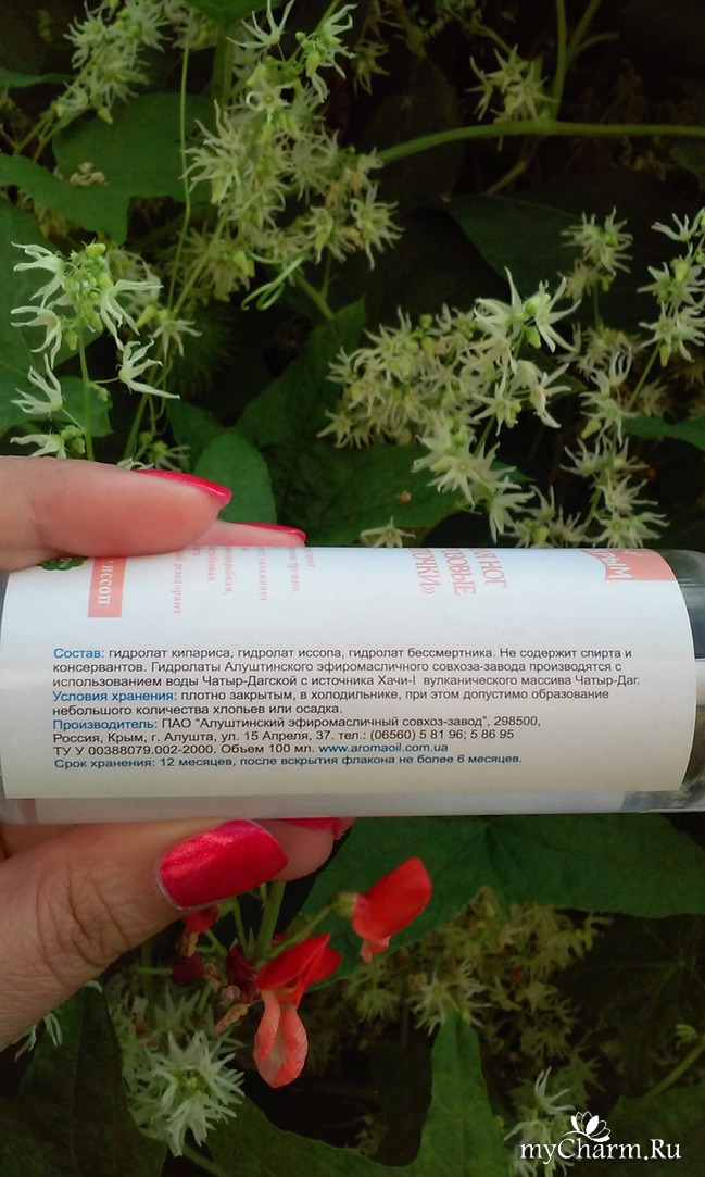 Отходя от обычного изложения мною обзоров на косметические средства, сегодня начну свой обзор с рассмотрения состава гидролата "Розовые пяточки". Итак, в состав входят гидролаты: кипариса, иссопа, бессмертника и все. Больше ни каких других ингредиентов в составе нет. Отсюда и соответствующее название у косметического средства - микс-гидролат. Это экологически чистый и натуральный продукт. Не содержит спирта, консервантов, отдушек и другой вредной химии.