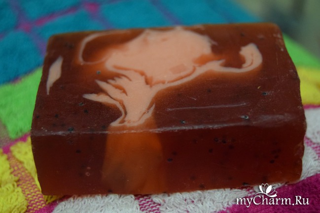 Мыло само по себе очень красивое. Красное (слегка прозрачное) с розовой размытой непрозрачной сердцевиной и с черными крапинками (кстати, такая расцветка мыла отлично вписалась в концепцию нашей ванной комнаты в черно-бело-красных тонах). Примерно через неделю пользования мылом эти самые крапинки (это мак?) начинают слегка ощущаться, получается легкий скраб-массаж рук.