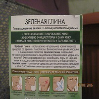 Среди них: глина голубая (антицеллюлитная), глина черная ( устраняет пигментацию), глина белая китайская ( питание и увлажнение), глина розовая ( питание и увлажнение в зимний период), глина зеленая.