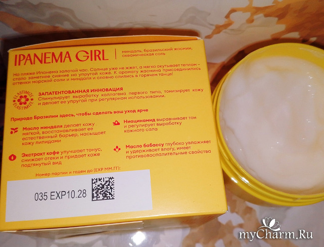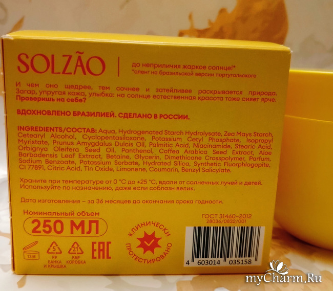 Оформление супер-летнее: и коробочка и баночка ярко-желтого цвета. Борьба с депрессивной зимне-бессолнечной погодой в самом разгаре. На одной грани коробки даже фото с кусочком моря есть: для полноты погружения в атмосферу жаркой Бразилии.