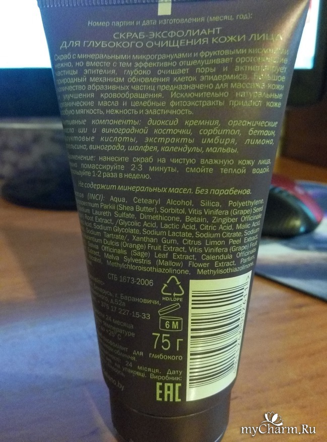Данный скраб не содержит парабенов и минеральных масел. Единственное, что меня смутило, что на тубе стоит значок хранить средство 6 месяцев после вскрытия, но защитной фольги на скрабе нет.