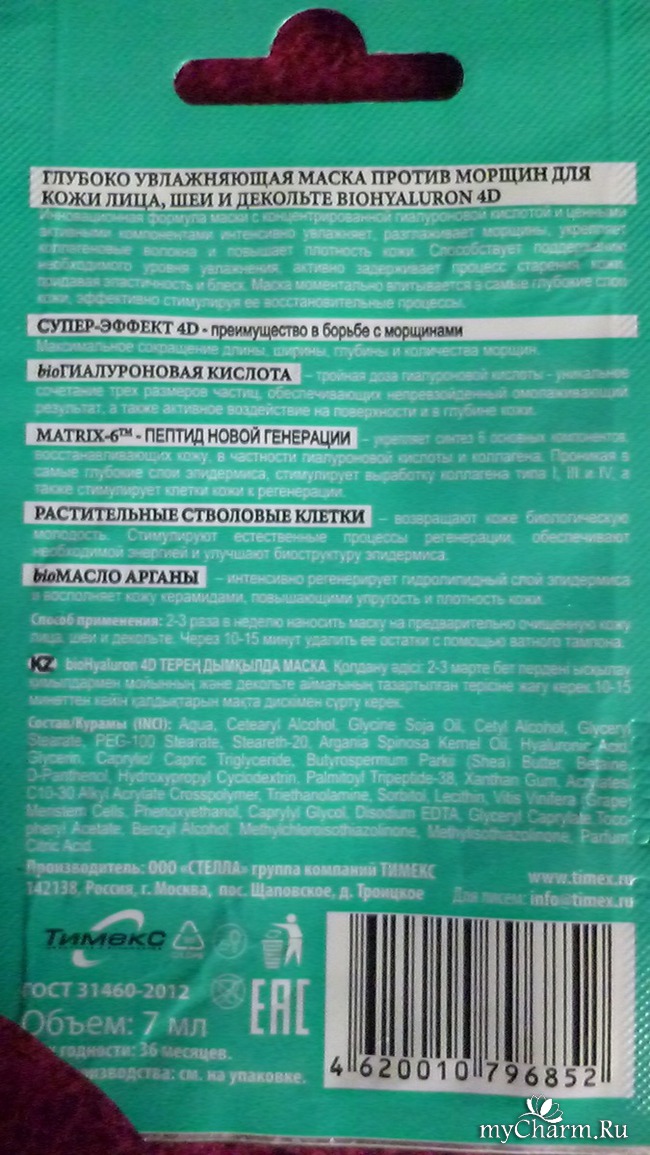 Обещается эффект на коже формата 4D, что вызывает немыслимое любопытство и стремление поскорее нанести маску на лицо, на все свои, упорно пробивающиеся морщинки.