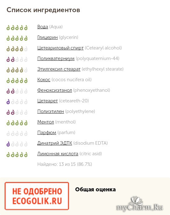 Найдено 13 компонентов из 15, но некоторые содержат оценку 1 и 2, а на упаковке стоит синий значок "100% натуральные ингредиенты". Хотя тут больше подошло бы уточнение "содержит 100%...", потому что всё-таки они есть: кокос, ментол, лимонная кислота, ну и вода с глицерином конечно же)
