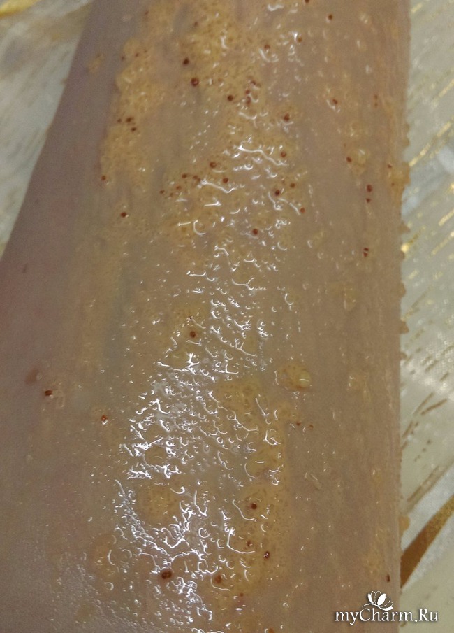 Скраб хорошо распределяется и во время проведения процедуры дает ощутимый массажный эффект. В основном, я чувствую именно морскую соль, хотя и скорлупы кедровых орехов в нем немало. Уже через пару минут начинает ощущаться тепло, которое разливается по всему телу. А так как в составе нет никаких разогревающих ингредиентов, то думаю, что так работает сочетание меда и соли.