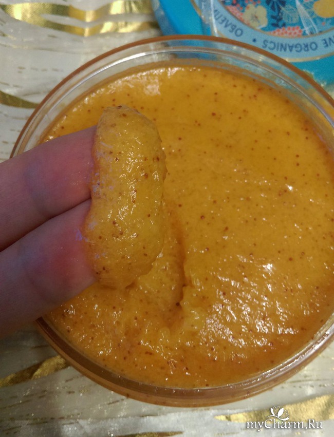 Скраб очень жизнерадостного оранжевого цвета с коричневыми частицами скорлупы кедрового ореха. Его консистенция густая, но в тоже время тягучая, как только начавший засахариваться мед. Я люблю такую консистенцию у скрабов, потому что если бы она была более сухая, то часть скраба неизбежно бы опадала с кожи в ванную. А с такой текстурой он хорошо распределяется на коже, и не спадает с нее даже при щедром нанесении.