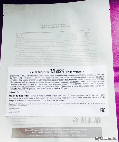 Уникальность косметики Cremorlab заключается в том, что она изготовлена на основе воды из минерального источника Гюмжин, которая благодаря своим терапевтическим свойствам увлажняет и оздоравливает кожу. Каждый экземпляр этого вида маски упакован в серый пакетик с удобными надрезами: