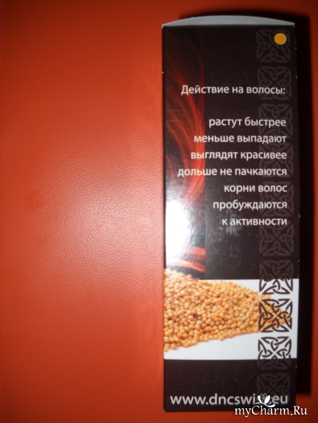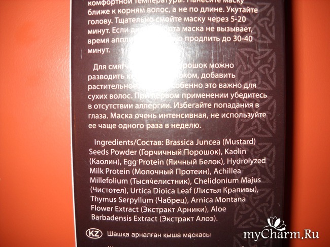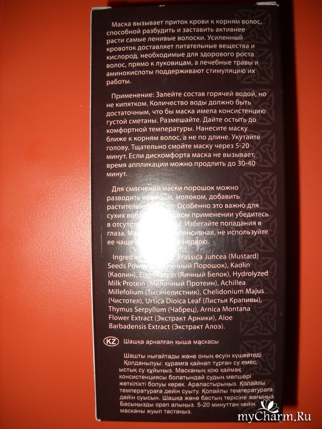А с другой стороны упаковки можно ознакомиться с информацией о том, какого результата стоит ожидать от применения этого чудодейственного натурального средства. Как выяснилось, горчичная маска поможет пробудить корни волос к активности и обеспечить их более быстрый рост. Волосы станут выглядеть гораздо эффектнее, меньше выпадать и гораздо дольше не пачкаться.
