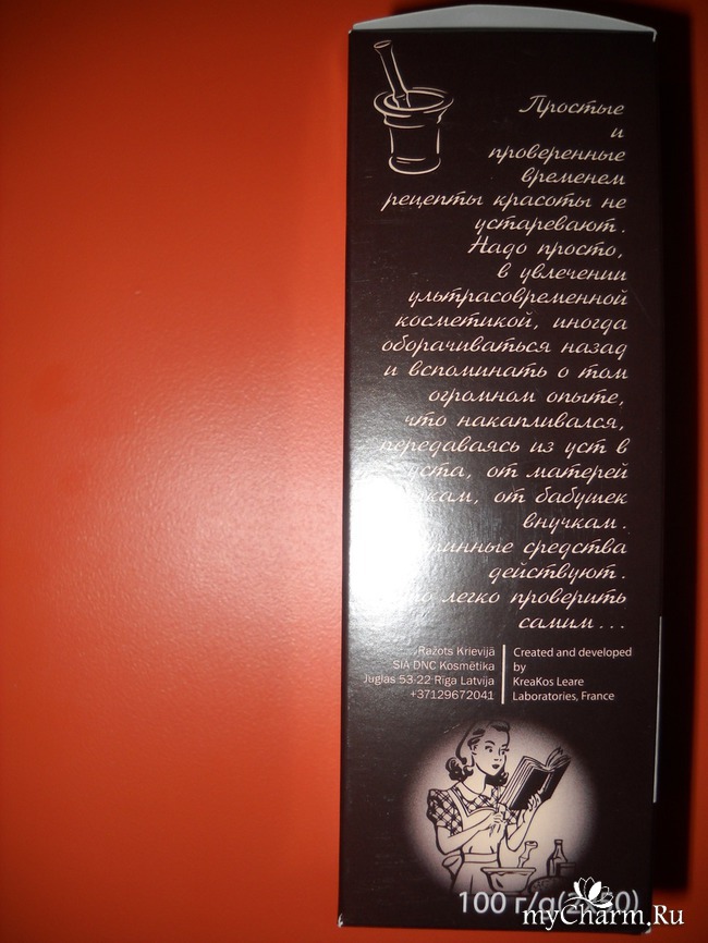 На одной из сторон коробочки заботливый производитель напоминает нам о том, что не стоит пренебрегать простейшими и проверенными временем и не одним поколением женщин рецептами красоты, которые не устаревают до сих пор. И как же он в этом прав, ведь такие простые и недорогие старинные средства действительно работают!