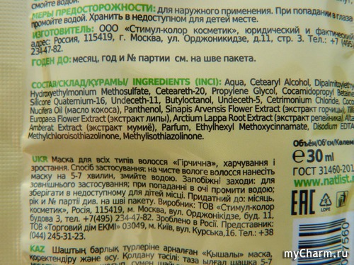Дизайн пакетика на сайте, думаю, уже вполне узнаваем: девочки с радостью делятся своими ощущениями от использования средств от Naturalist. В пакетике содержится 30 миллилитров средства – этого количества может хватить как на один, так и на два раза (зависит от густоты и длины волос). Мне с моей длиной до плеч хватило половину пакетика. Но об этом чуть позже.