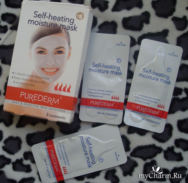 Самонагревающаяся увлажняющая маска от популярного корейского бренда Пьюадерм выпускается в белой коробочке небольшого размера с изображением женщины с маской на лице. На лицевой стороне упаковки нарисованы языки пламени, прямое указание, что будет «тепло». В коробочке 3 саше со средством, объем – 6,2 г. Мне его, кстати, хватает на две полноценные процедуры.