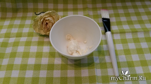 Чтобы было удобнее наносить маску на лицо, я ее выдавила в мисочку. Маска белого цвета, столько ее было в пакетике.