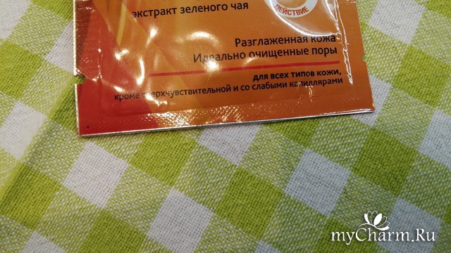 Ну и познакомлю пожалуй вас с виновницей сегодняшнего обзора. Масочка вот в таком маленьком одноразовом пакетике-саше из фольгированной бумаги. Маска с глиной, маслом ромашки и экстрактом зеленого чая. Подходит для всех типов кожи. Но если у вас сверхчувствительная кожа или со слабыми капиллярами, от использования маски лучше отказаться.