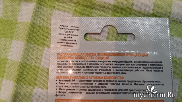 Производитель обещает, что активный компонент Коэнзимы Q10+R поможет сократиться имеющимся морщинам и не даст образоваться новым. Глина притягивает и устраняет токсичные вещества, работает как антисептик и укрепит защитные функции кожи. Масло ромашки снимет покраснения и раздражения, а так же устранит сухость и усталость. экстракт зеленого чая выступает антиаксидантом и защитит кожу от от вредных воздействий внешней среды.