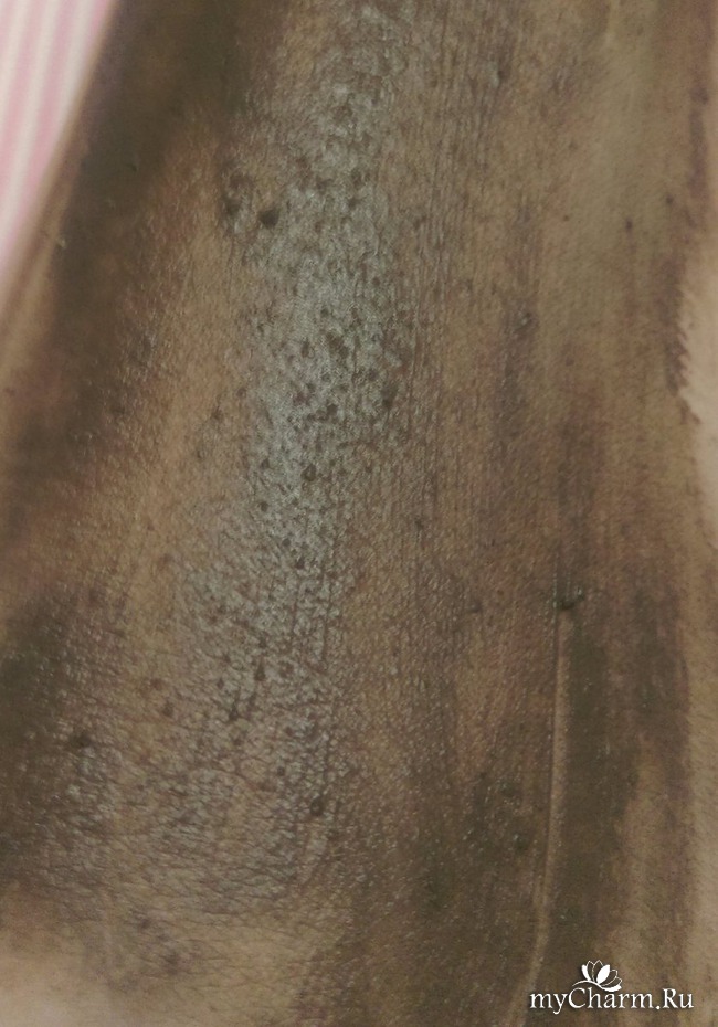 Из-за присутствия глины, смывается средство с небольшим трудом, но это даже хорошо, ведь пока мы смываем его, частицы кофе и соли дополнительно массируют кожу.