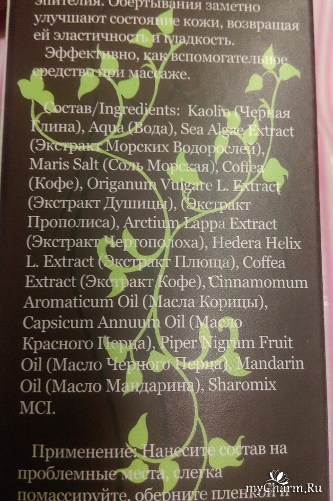 В составе я не нашла ни одного вредного ингредиента, там только известные борцы с "апельсиновой коркой", такие как: черная глина, обладающая дренажными свойствами; экстракт морских водорослей, который выравнивает кожу; морская соль, выводящая излишки жидкости из тела и питающая кожу минералами; кофе, обладающий липолитическим действием.