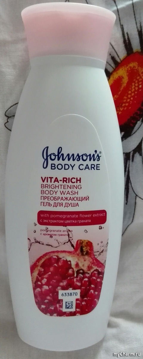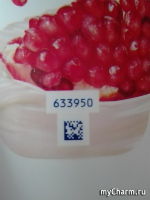 Белый непрозрачный флакон, имеющий по одной наклейке с обеих сторон. С лицевой стороны у нас красуется рисунок граната, привлекающий все свое внимание.