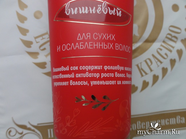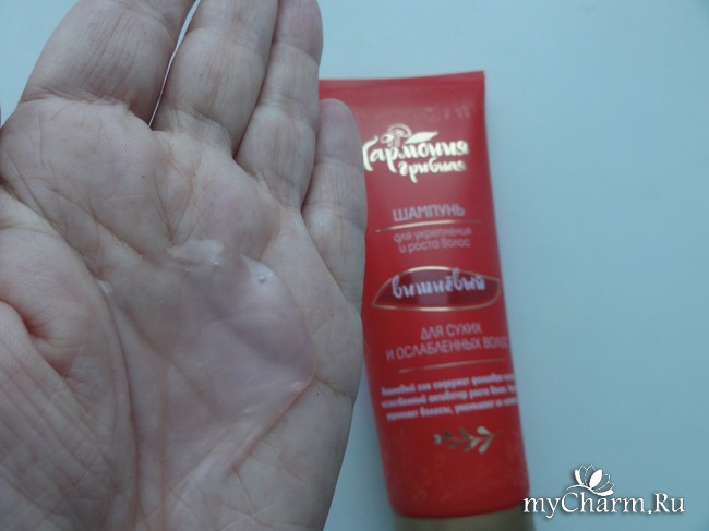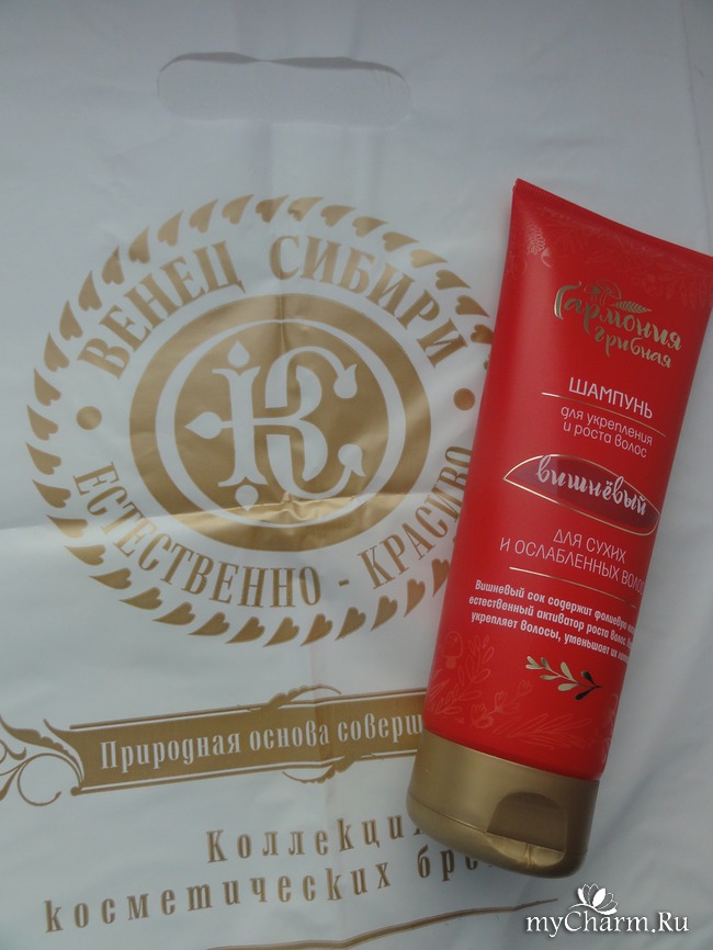 На тест достался шампунь Вишневый серии «Грибная гармония», который кроме того что делает волосы чистыми, способствует их росту и укреплению, подходит он больше сухим волосам, а мои волосы можно называть именно такими, поскольку они тонкие и волнистые.