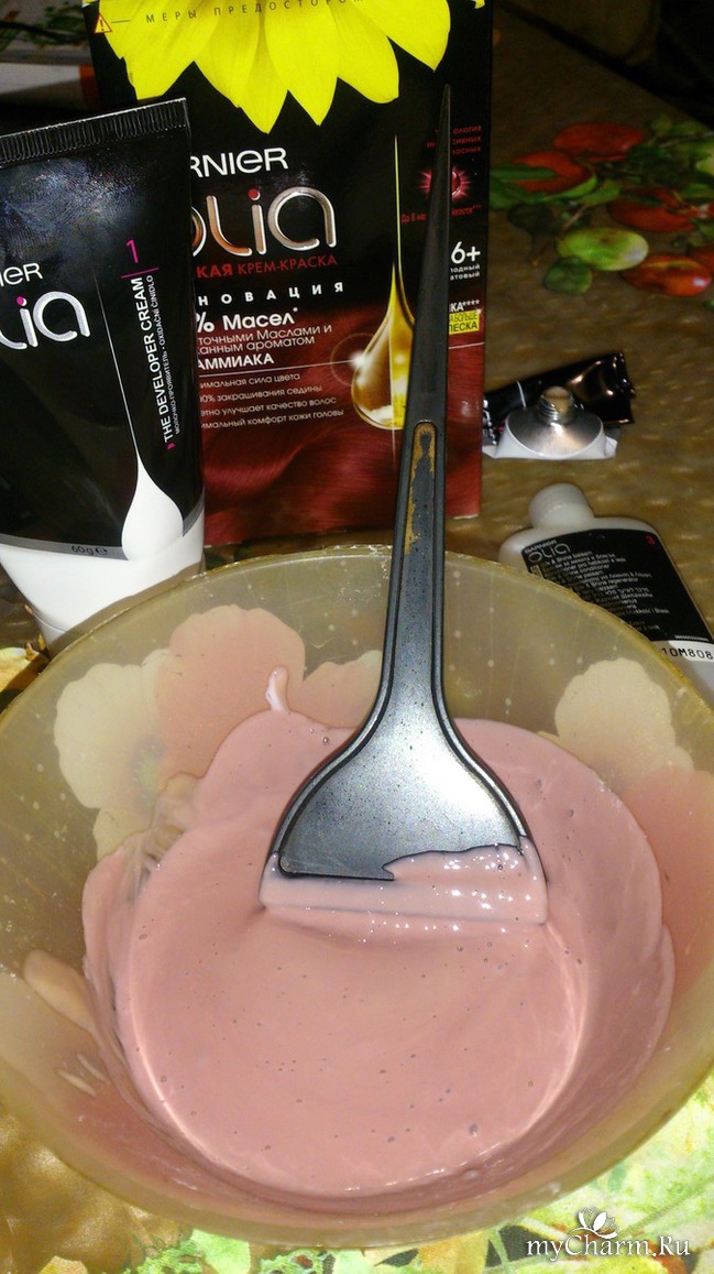 С наступлением весны захотелось мне ярких красок. И не только в одежде. В магазине выбирала краску для волос. Рыжей я была... блондинкой была... шоколадной тоже была.. и вот приглянулся мне цвет холодный гранатовый. Купила для эксперимента крем-краску Garnier Olia. Номер 6.6. Это стойкая крем-краска относится к без аммиачным.