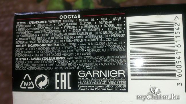 Внутри упаковки находятся:один тюбик с молочком-проявителем, один тюбик с крем-краской, одна бальзам уход "Шелк и блеск", одна пара перчаток и инструкция. Производитель обещает сто процентное закрашивание седины, до восьми недель стойкости, интенсивный цвет и в три раза больше блеска. В производстве применены технологии интенсивных красных и инновационная формула, включающая 60% цветочных масел.