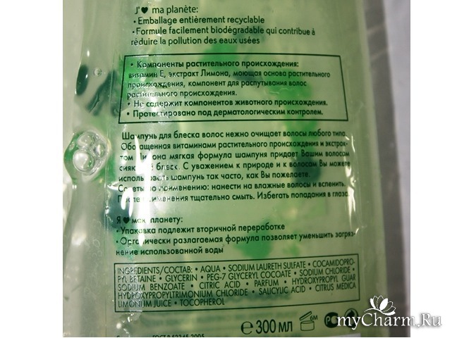 Сам шампунь в меру густой, практически прозрачный, с легким оттенком зелени. Отлично мылится и очень экономичен. Промывает длинные волосы за несколько раз, даже если они были сдобрены лаком или муссом для укладки. Он хорошо справляется в различными загрязнениями. Легко смывается, а волосы чуть поскрипывают в руках.