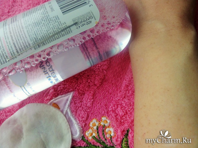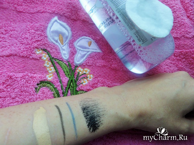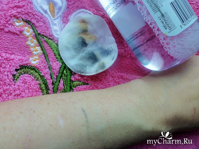 Мицеллярная вода хорошо очищает кожу лица от тонального крема, макияж с глаз снимает не с первого раза.На фото можно увидеть, что след от карандаша для век после первого очищения все же остался. Хоть производитель и уверяет, что очищение происходит с помощью одного ватного диска, но я, чтобы очистить один глаз полностью, использую 2 ватных диска и ватную палочку, смоченную тоже мицеллярной водой.