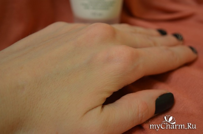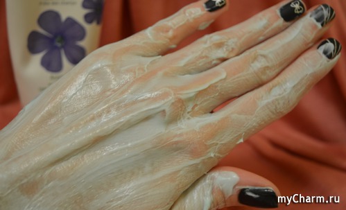 Распределяется маска по коже рук легко, без комков. Консистенция однородная. Необходимо наносить достаточно толстым слоем, так как продукт имеет хорошую впитываемость кожными покровами.
