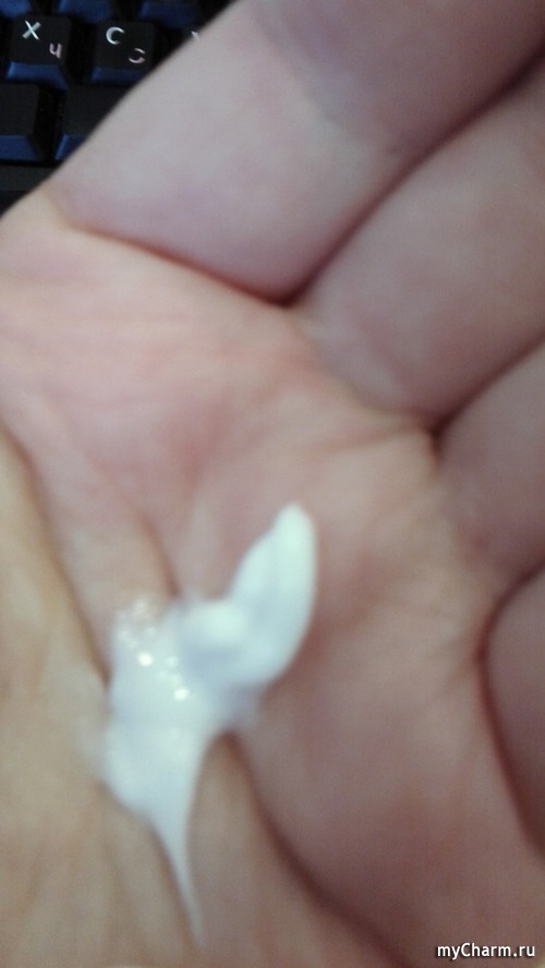 Текстура крема белого цвета, довольно-таки густая, нежная, запах приятный, но при выдавливании крем легко выходит из тюбика сплошной струей, не прерываясь, как бывает с кремами более жирными.