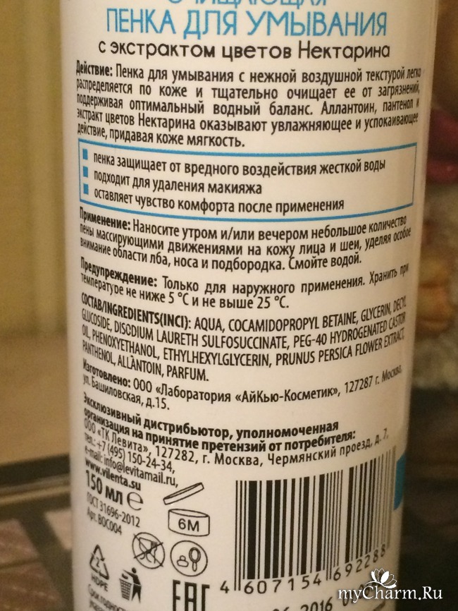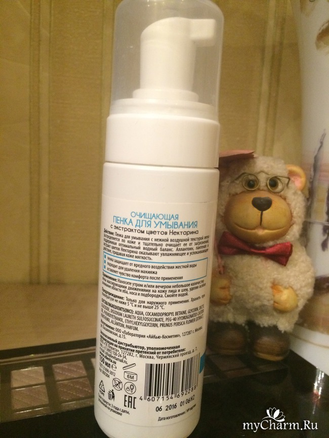 Состав очищающей пенки неплохой, но все же присутствуют синтетические компоненты. В конце списка можно увидеть такие компоненты как аллантоин, экстракт цветов Нектарина и пантенол.