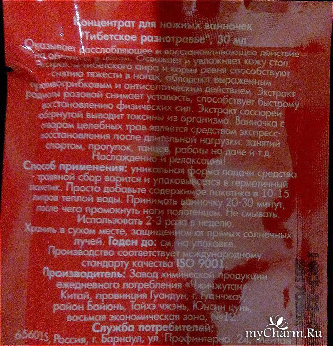 Производитель обещает, что при применении ванночек вы получите потрясающий расслабляющий эффект, снимется дневная усталость с ног. Входящие в состав продукта тибетские травы обладают мощным антисептическим действием, помогая справляться с проблемой различных кожных повреждений: ожогами, порезами, ссадинами. Что ж, спешу в этом убедиться на практике.
