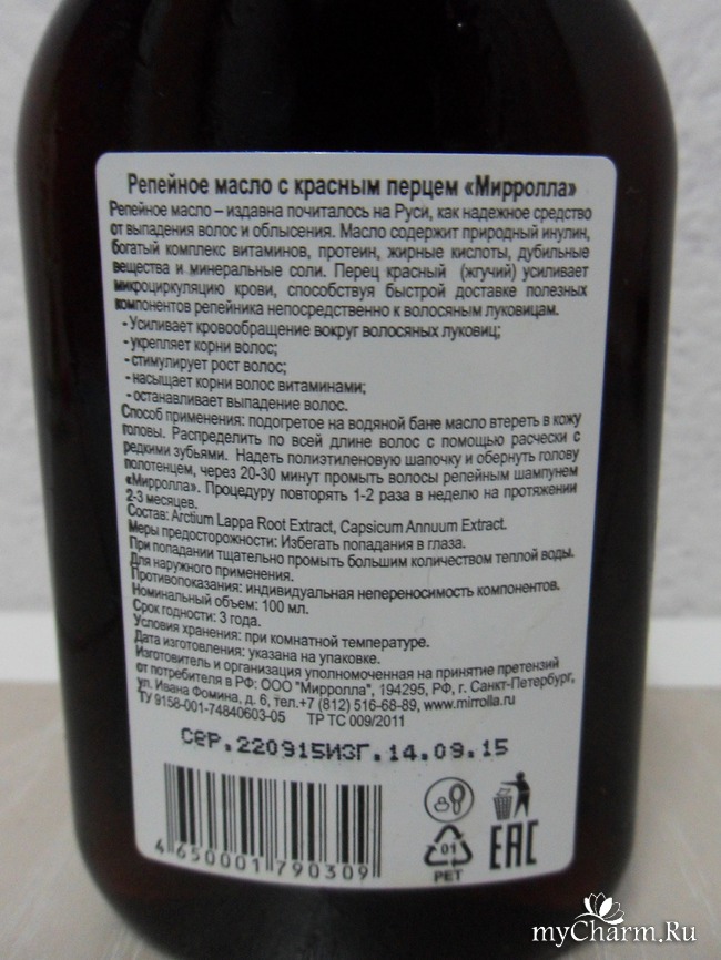 Пришло время рассказать Вам о хваленом мною много раз репейном масле фирмы «Мирролла». Давным-давно у меня был неприятный опыт использования репейного масла: я замучилась его смывать, неделю смывала, наверное. А я его еще и покупала за большие для меня тогда деньги. После этого у меня сложилась крайняя неприязнь к данному средству для укрепления волос. Чуть больше полугода назад сноха посоветовала мне его – репейное масло с экстрактом красного перца «Mirrolla». Цена этого чудо-масла – около 40 рублей, иногда и дешевле. Покупаю в основном в аптеке, но бывает и в Фикс-прайсе (там дороже).