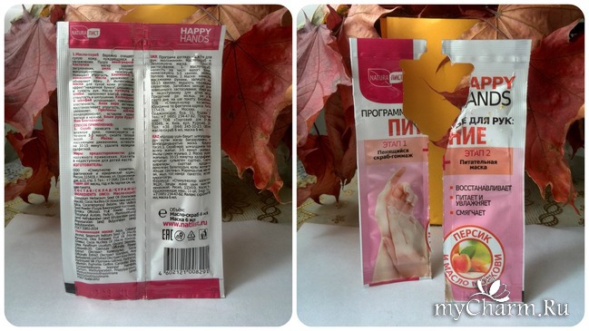 Уходовое средство для рук представлено в маленьком пакетике, поделенном на две части. В одной половине пакета находится пенящийся скраб-гоммаж, в другой питательная маска. Объем каждого средства составляет по 6мл. На задней части упаковки представлено: описание продукта, состав, срок годности, инструкция к применению. Все важные и нужные элементы присутствуют, за это большой плюс производителю. Хочу отметить срок годности довольно большой, в моем случае до: 08.2018.