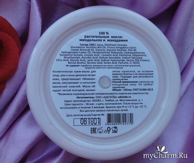 Увлажнение от маски достаточно эффективное, также, как и питание, которое осуществляется за счет масел – миндального и макадамии, пантенол заживляет кожу, ниацинамид оказывает омолаживающий эффект. Маска содержит еще и ряд витаминов и кислот, которые оказывают свой эффект, питая, омолаживая, увлажняя эпидермис.