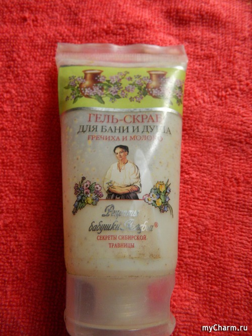 Гель-скраб для бани и душа «Гречиха и Молоко» заключён в тюбик, который весьма уверенно стоит на широкой крышечке. Дизайн упаковки внушает доверие: тут и растения изображены, которые должны присутствовать в средстве, и бабушка Агафья, щедро делящаяся с нами секретами красоты. Лично мне такая упаковка импонирует, хотя, скорее всего, просто хочется верить, что в данном средстве действительно есть натуральные компоненты.