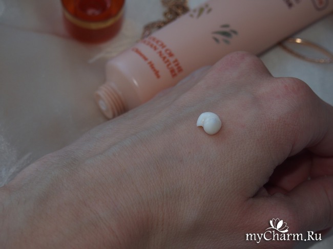 Аромат маски напоминает мне не очень премиум-бренд, я бы сказала, даже какой-то дешевый. Это странно, но маска на самом деле хорошая. Она плотным слоем ложится на лицо, кремовая текстура молочного цвета.