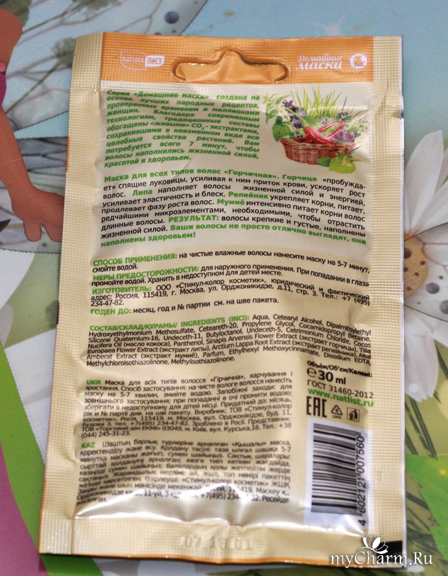На обратной стороне изложена информация о маске: описание, способ применения, меры предосторожности, изготовитель, срок годности, состав.