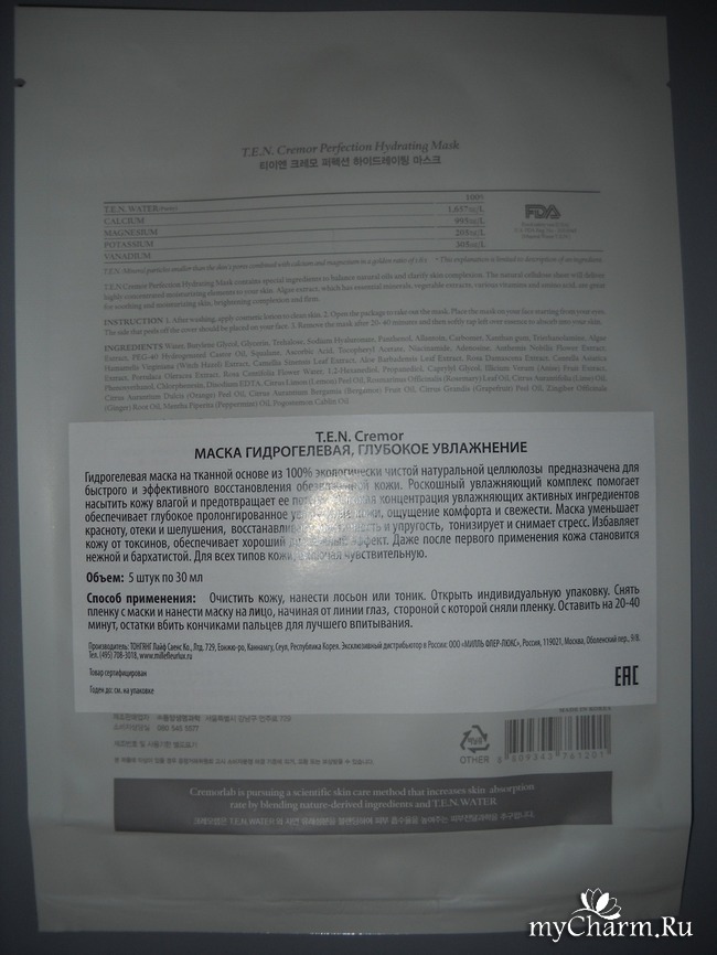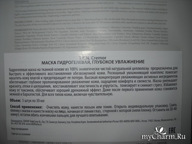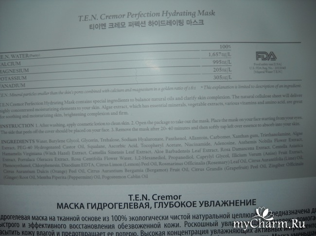 На обратной стороне упаковки можно найти более подробную информацию о продукте, в том числе и на русском языке. Как выяснилось, эта гидрогелевая масочка на тканной основе из стопроцентно натуральной экологически чистой целлюлозы активно способствует быстрому и эффективному восстановлению обезвоженной кожи. Великолепный увлажняющий комплекс, входящий в состав данной маски, не только помогает насытить кожу влагой, но и способствует предотвращению ее потери. А высочайшая концентрация активных увлажняющих ингредиентов дарует коже ощущение свежести и комфорта и обеспечивает ее пролонгированное глубокое увлажнение.
