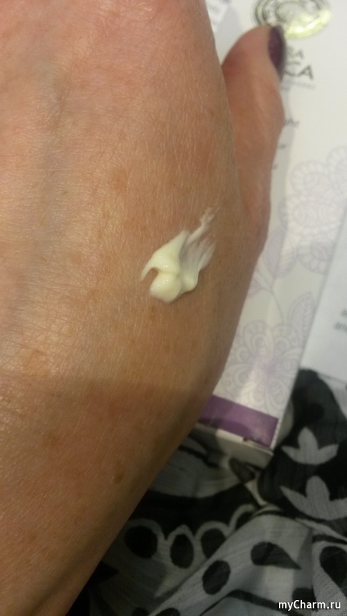 Маска светло-кремового цвета, с тонким ароматом трав, консистенция очень мягкая, маслянистая.