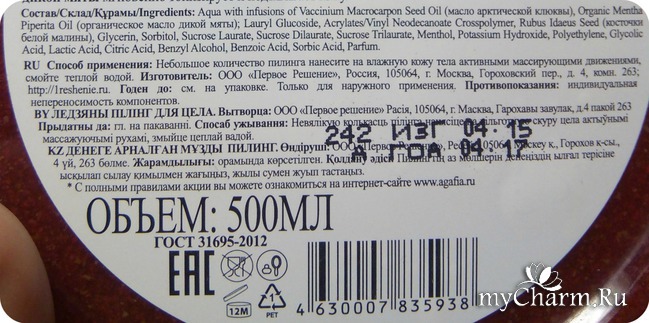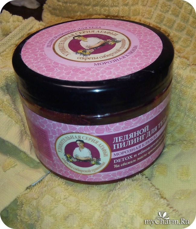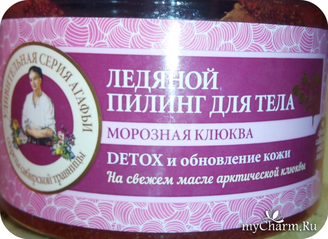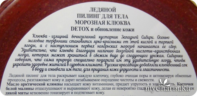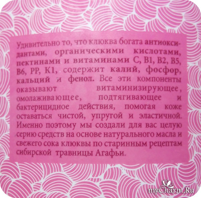 Как видим, обещания Агафьи гласят, что наша кожа пройдет процедуру Detox, а по-простому - очищения и обновится. А морозная клюква принимает во всей этой процедуре главное участие. Так же производитель акцентирует наше внимание на том, что изготовлен сей продукт на свежайших (верится с трудом) сибирских соках и маслах.