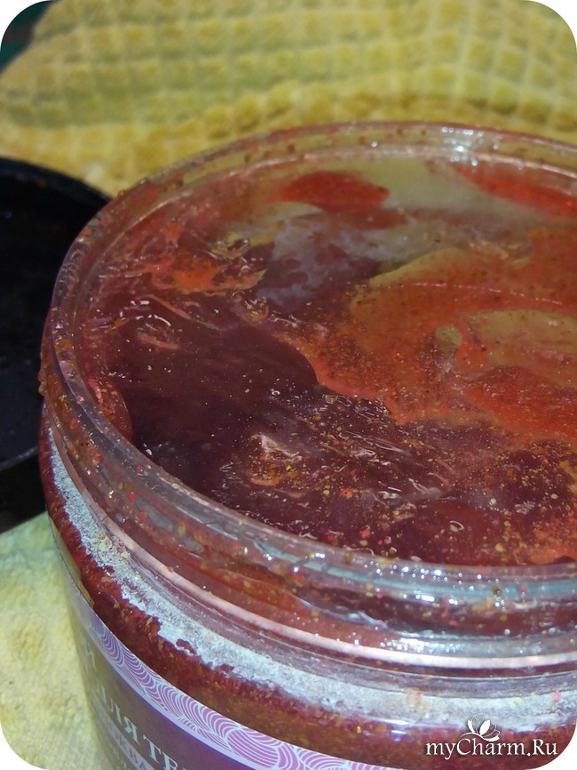 Текстура гелеобразная красного полупрозрачного цвета, с микрочастицами, отвечающими за отшелушевающий эффект.