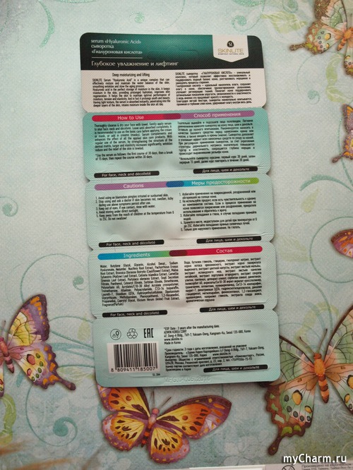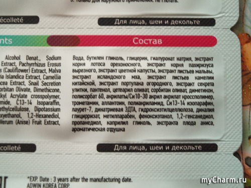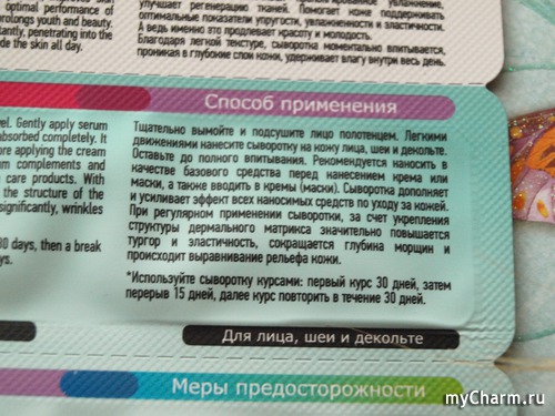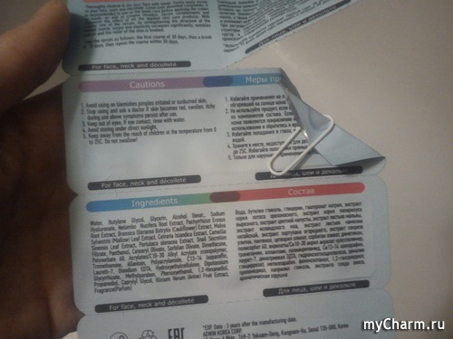 Упаковка состоит из 4 пластин по 2 грамма, которые независимы друг от друга. Можно такую конструкцию разъединить на части (подарить подруге, взять с собой в путешествие и т. п.). Вполне удобно. Одной такой «капсулы» хватит на несколько применений (зависит от площади использования). Вы вполне успеете пройти курс из 15 дней, нанося на все лицо + шею. Здесь производитель все хорошо продумал. И люблю корейские средства. Производитель обычно не жалеет количества средства (не требуется собирать по стеночкам, как это обычно делают европейские производители).