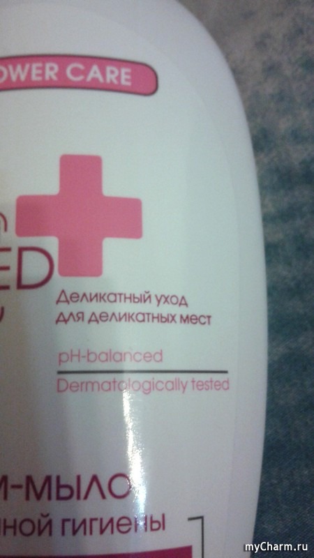 В правом углу белой этикетки содержатся короткие надписи розовым мелким шрифтом: «деликатный уход для деликатных мест», «ph-balanced», «dermatologically tested». Думаю, не надо быть знатоком английского языка и перевода не требуется, и так все понятно.