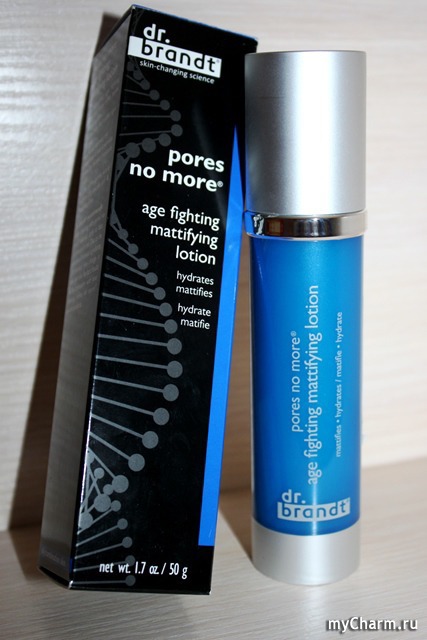 Учитывая все перечисленные обстоятельства, я запаслась очень даже любопытным вариантом. Моя ближайшая знакомая пользуется им уже более года и вполне довольна. Мой опыт более скромный – около месяца. Зато уже есть что рассказать. Знакомьтесь – Dr. Brandt Pores no more age fighting mattifying lotion – Лосьон против признаков старения с матирующим эффектом от бренда Dr. Brandt.