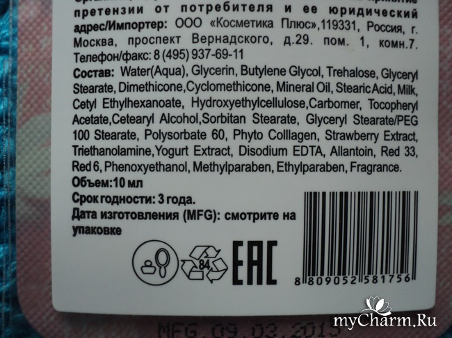 О составе. Не скажу, что состав идеальный, но довольно приемлемый. Присутствует заявленный йогурт (правда, в описании состава указано – milk), к сожалению, не имею понятия в каком виде он внесен в маску, но было бы интересно ознакомиться с этой информацией. Также в составе числится Tocopheryl Acetate (витамин Е) – компонент, являющийся мощным антиоксидантом, предотвращающим первые признаки старения, обеспечивающих защиту от ультрафиолетовых лучей и других негативных явлений окружающей среды. Не менее привлекателен и полезен Phyto Collagen – компонент, сохраняющий гладкость, упругость и эластичность кожи. Это именно то, что сейчас требуется моей коже. Профилактика преждевременного старения, так сказать! Еще в составе заявлен Strawberry Extract – растительный компонент, оказывающий противовоспалительный эффект и способствующий сужению пор. Не могу не отметить Allantoin – натуральный компонент, оказывающий увлажняющее и смягчающее действие. В конце списка «красуются» парабены, но в маске их минимальное количество.