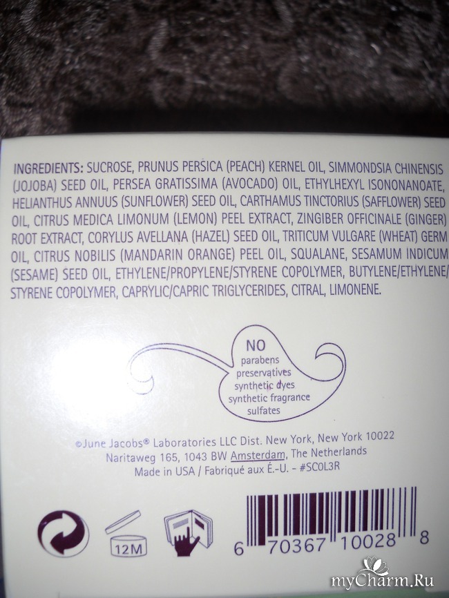 Особенно меня порадовал состав сахарно-лимонного скраба – в нем отсутствуют консерванты, сульфаты, парабены и искусственные ароматизаторы. Восстановить шелковистость кожи помогают входящие в состав скраба масла: зародышей пшеницы, лесного ореха, авокадо, кунжута и сафлора. Великолепное ее смягчение обеспечивают содержащиеся в средстве абразивные гранулы сахара. Аскорбиновая кислота в составе, помимо механического отшелушивания, способствует еще и химическому. А натуральный цитрусовый лимонный аромат дарит ощущение комфорта и свежести. Нельзя не отметить, что запах у этого средства просто невероятный! И при этом продукция June Jacobs не ароматизируется искусственным путем!