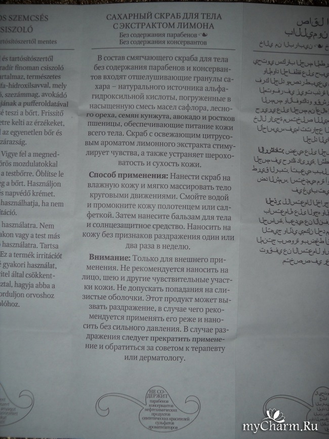 Когда я не увидела на коробочке ни слова на русском языке, первым делом меня посетила мысль о нарушении прав потребителей. Тем не менее, все права потребителей оказались соблюдены в полном объеме – внутри коробочки лежала инструкция сразу на нескольких языках. И уже через несколько минут мне удалось составить полное представление о том, как нужно пользоваться сахарно-лимонным скрабом, а также как он может проявить себя на моей коже.