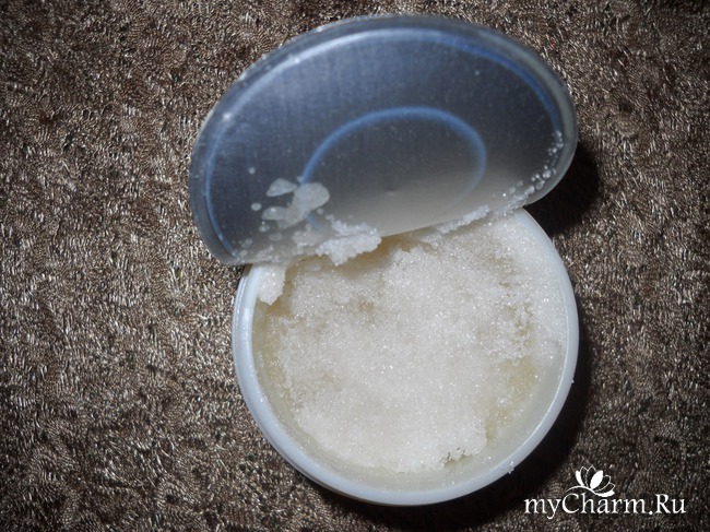 Теперь можно познакомиться и с самим скрабом. Баночка с чудодейственным средством для тела упакована очень герметично, так что даже при всем желании до него не смогут добраться ни любознательные продавцы, ни дерзкие покупатели. Сверху четко видна сахаристая консистенция скраба, а если приглядеться повнимательнее, то можно разглядеть и его масляную основу. Более четко она просматривается по бокам баночки. Цвет средства полностью натуральный, никаких красителей в нем нет, что опять же радует. Перед использованием скраба нужно обязательно захватить и сахаристую часть средства, и масляную, то есть попросту скраб нужно перемешать. Особенно приятно то, что это великолепное средство подходит для всех типов кожи.