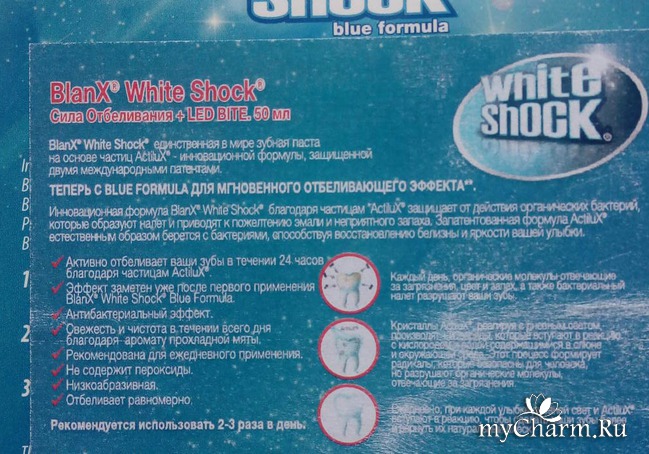 Поскольку я не являюсь офисным работником, могу себе позволить чистить зубы больше 2-х раз в день. Первое время я так и поступала, дабы усилить эффект, тем более производитель советует осуществлять процедуру чаще. Сейчас вошла в стандартный режим, то есть утром и перед сном, но активатор всегда выдерживаю в течение 2-3 минут. Один раз в неделю выдерживаю активатор 10 минут. К упаковке приложена специальная линейка (точнее она встроена с боковой стороны коробки), по которой можно определить степень белизны зубов, скажу вам, очень удобно. Я периодически прикладывала ее, дабы оценить эффективность пасты и активатора.