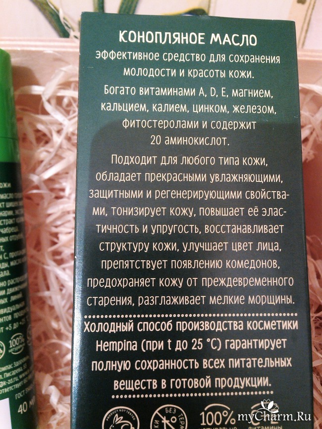 Конопляное масло неоправданно забыто современниками и мало применяется в косметике. Оно исстари известно своими полезными и лечебными свойствами. Конопляное масло образует на коже защитный барьер, который защищает кожу от вредного воздействия окружающей среды и раздражителей.