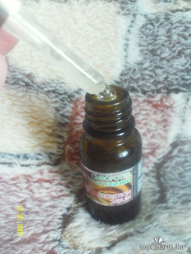 Мои впечатления от применения крема. По привычке, применяю данную сыворотку перед тем, как ложиться спать. Открыв флакончик и набрав некоторое количество средства в дозаторную пипетку, выливаю ее в ладонь. Затем легкими движениями пальцев наношу ее по массажным линиям на кожу лица. Запах у сыворотки не совсем приятный, думаю, уж точно тут что-то связано с улитками. Капелька сыворотки полупрозрачная, мутноватая, практически не растекается по руке. Распределенная по лицу, она сразу освежает кожу, быстро впитывается, не оставляя после себя никаких жирных следов.