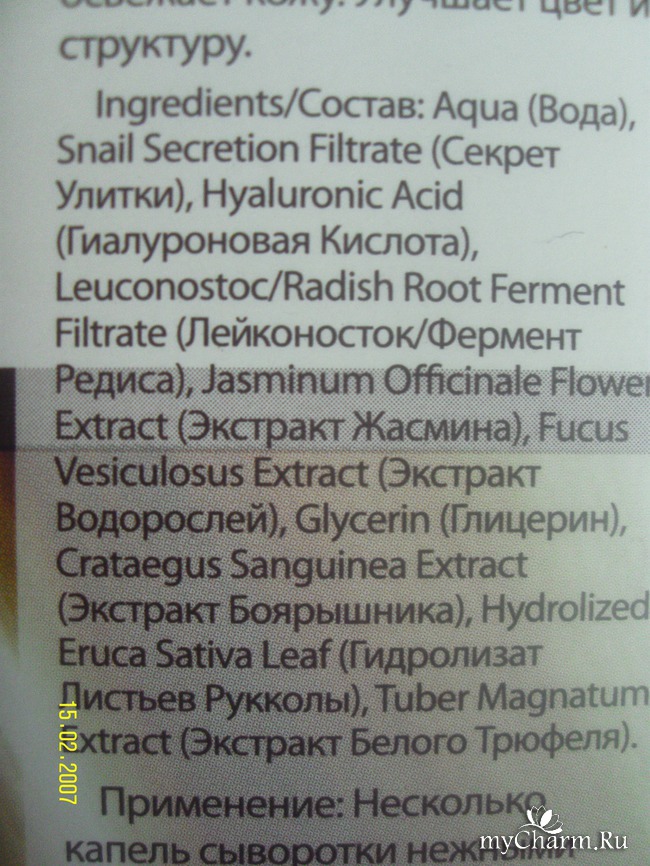 Состав сыворотки. И, как всегда, пою хвалебные оды продукции ДНЦ, вернее, ее натуральному составу! Здесь, как всегда, куча полезных компонентов, в список которых вошла и гиалуроновая кислота, и экстракты растений, и, конечно, секрет улитки, благодаря которому сыворотка и обладает таким замечательным эффектом.